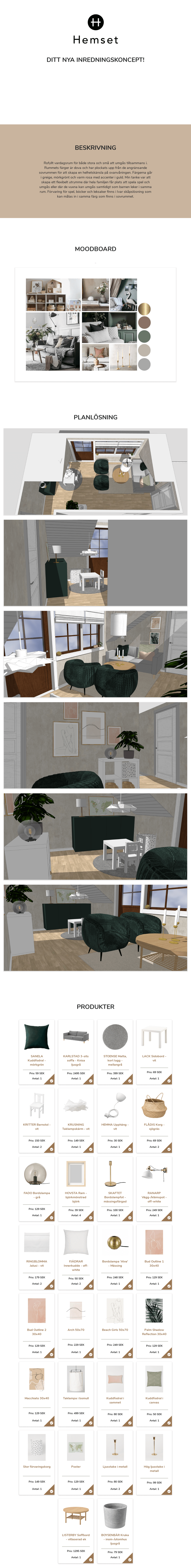 Se hur utvalda inredningskoncept levereras till våra kunder. Genom att fortsätta scrolla guidas du igenom konceptet där du får en beskrivning, moodboard, planskiss och en digital shoppinglista med alla produkter som är framtagna och anpassade efter kundens behov och önskemål.